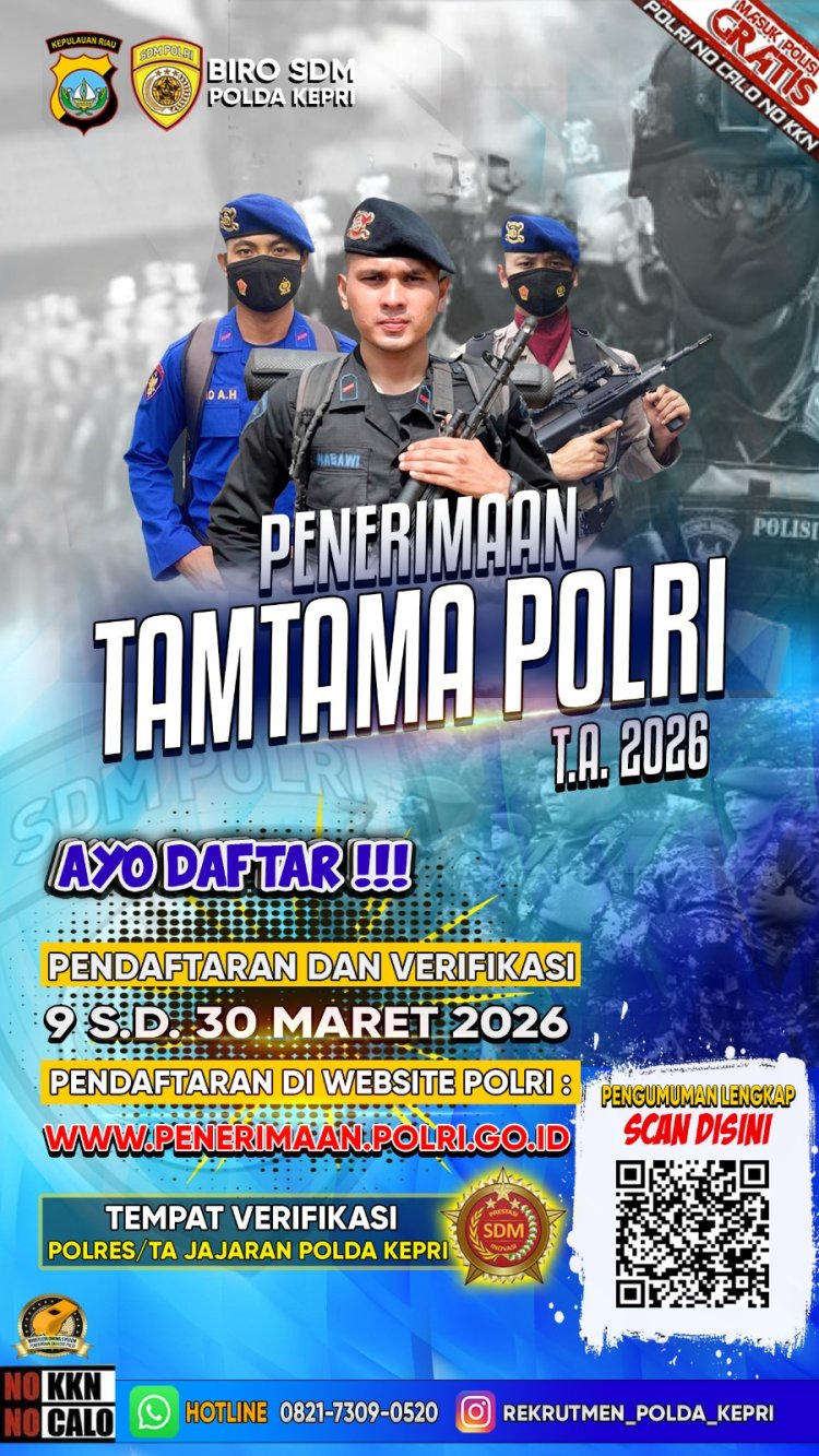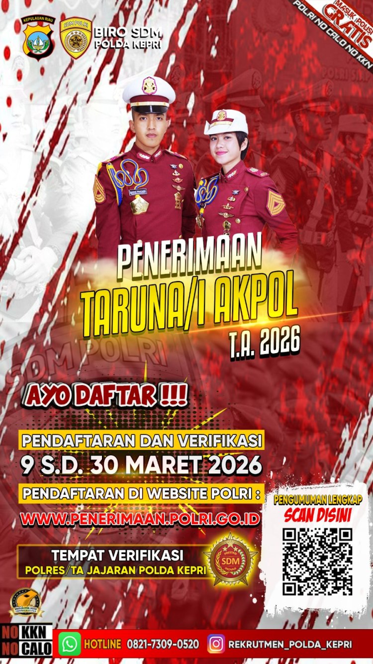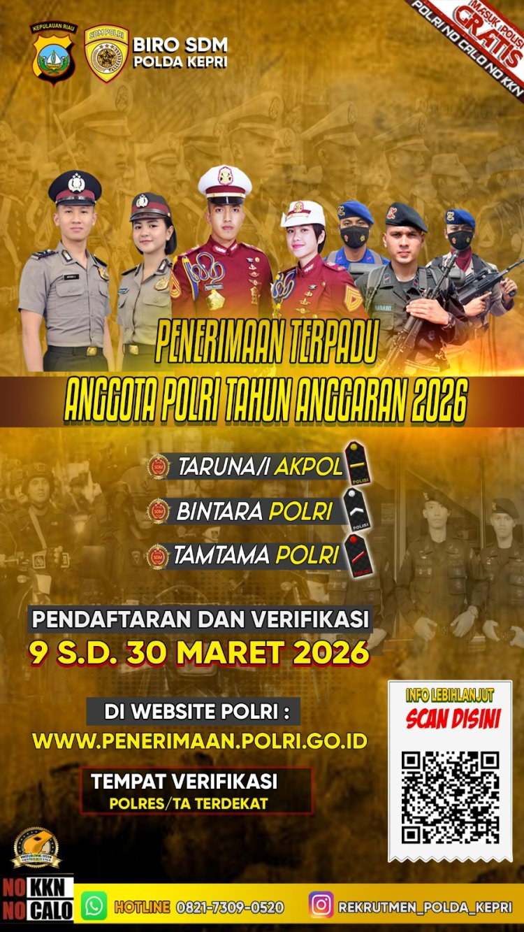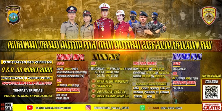 Batam24.com l Batam – Kepolisian Daerah Kepulauan Riau mengajak putra-putri terbaik di wilayah Kepulauan Riau untuk bergabung menjadi anggota Polri melalui Penerimaan Terpadu Anggota Polri Tahun Anggaran 2026 yang meliputi jalur Taruna Akademi Kepolisian (Akpol), Bintara Polri, dan Tamtama Polri.
